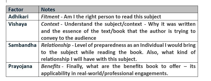 The ancient Indians long back identified the above technique to acquire knowledge on complex subjects such as Vedas/Upanishads. Understanding those 04 limbs in detail would help to acquire and digest the new subject of interest would immensely help. It acts as the best filter mechanism for anyone to reduce the number of readings that may not be so beneficial. I believe, the same technique shall be adopted for any personal reading as well. It has universal appeal.